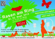 "Rasen am Ring" findet heuer bereits zum neunten Mal statt. Bei Rasen am Ring - wie immer am 22. September, dem Autofreien Tag, befreit die Plattform "Autofreie Stadt" zwischen 12:00 und 19:00 Uhr den Ring von motorisiertem Verkehr und tritt damit für einen autofreien Ring und somit für mehr Lebensqualität für Wien und dessen BewohnerInnen ein.